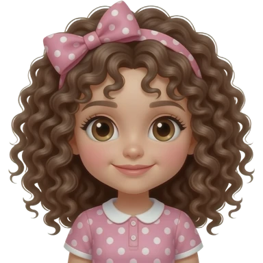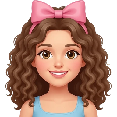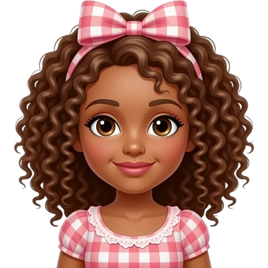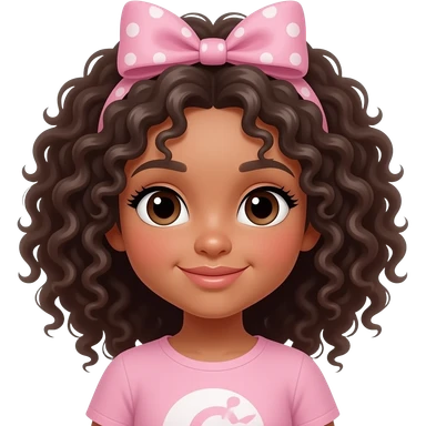 menina com cabelos cacheados castanhos e com um laço rosa e blusa b emoji