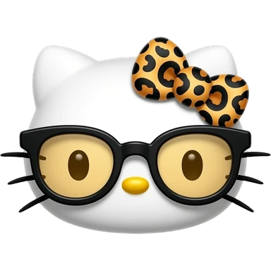 A minimalist Apple-style emoji of Hello Kitty's face. She has no mouth, small whiskers, a yellow nose, and is wearing thick-rimmed black glasses with amber lenses and a leopard print bow, centered on a solid black background emoji