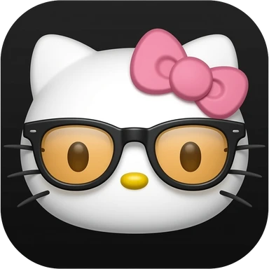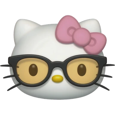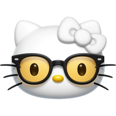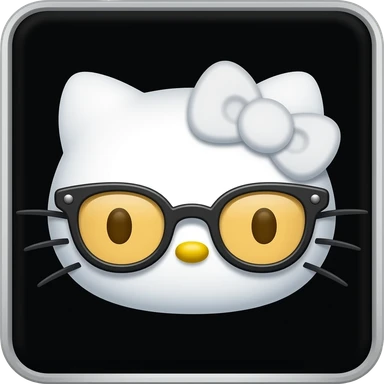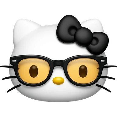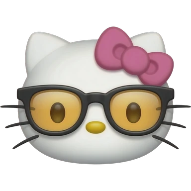 A minimalist Apple-style emoji of Hello Kitty's face. She has no mouth, small whiskers, a yellow nose, and is wearing thick-rimmed black glasses with amber lenses and a white bow, centered on a solid black background emoji