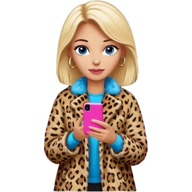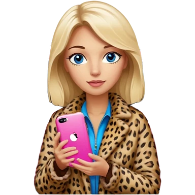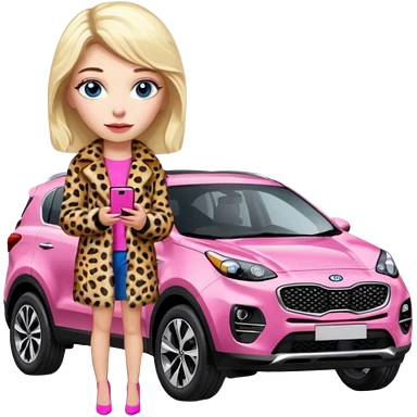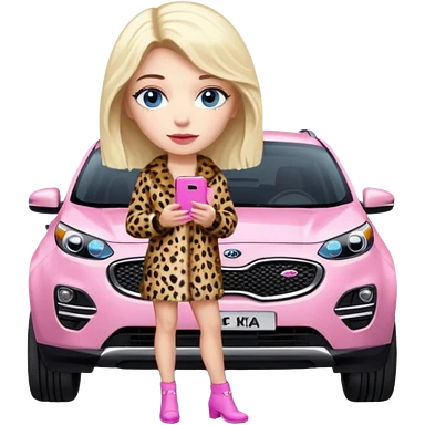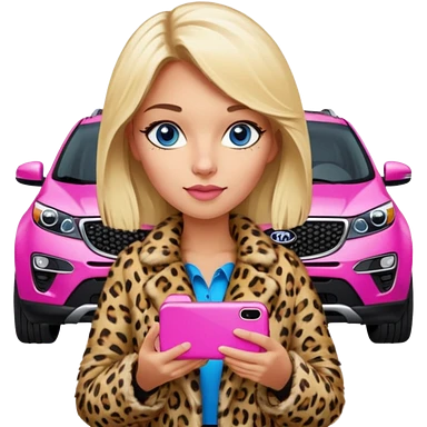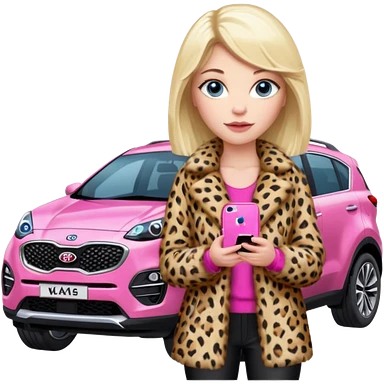 a blondie queen Arina in a leopard fur and pink iPhone on her kia Sportage car. blue eyes emoji