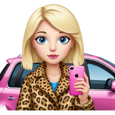 a blondie queen Arina in a leopard fur and pink iPhone 16 on her kia Sportage white car. blue eyes emoji