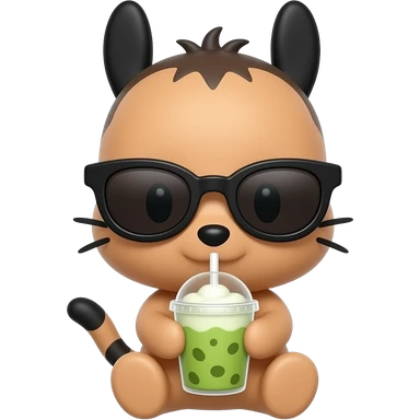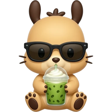 Pochacco(from sanrio) with tanned skin, holding iced matcha latte, wearing cat-eye sunglasses emoji