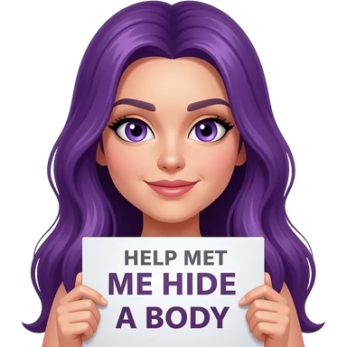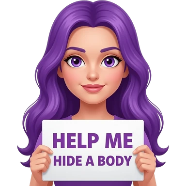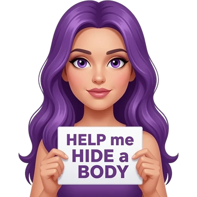 sexy girl with long purple hair and purple eyes holding a HELP me HIDE a BODY sign emoji