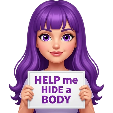 girl with long purple hair holding a HELP me HIDE the BODY sign emoji