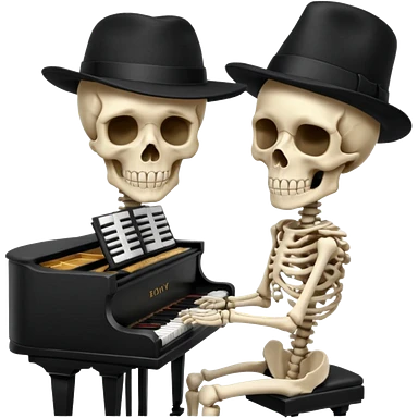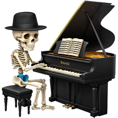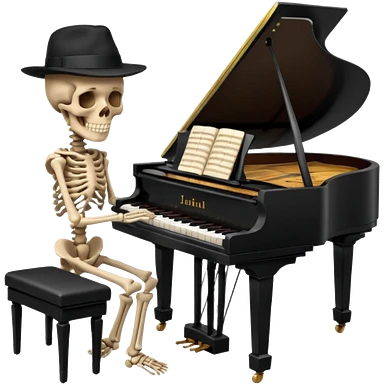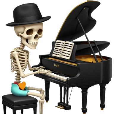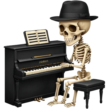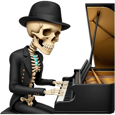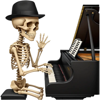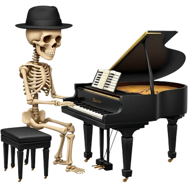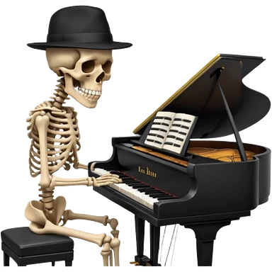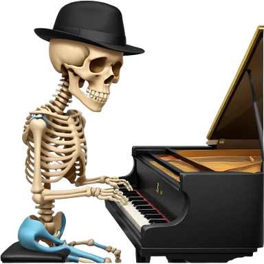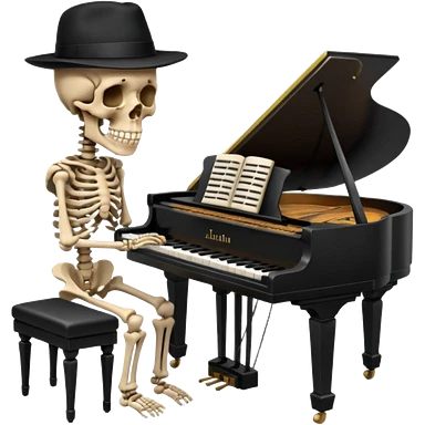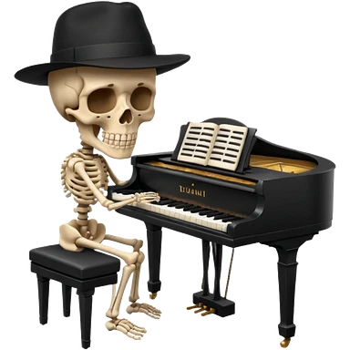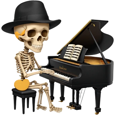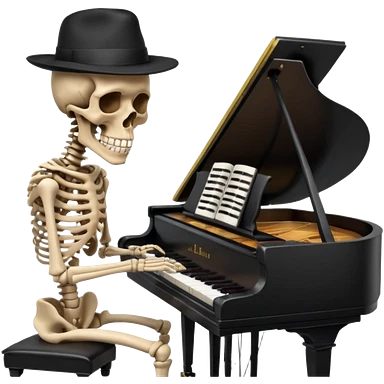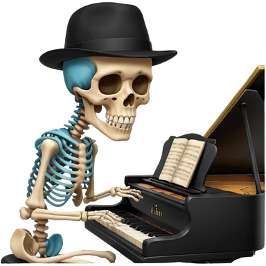 a human skeleton in anatomical proportion wears a black hat and plays the piano emoji