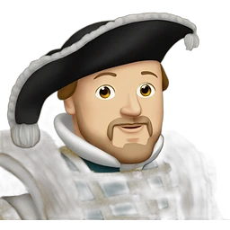 Henry VIII as an emoji, smiling, wearing Tudor attire and feathered cap emoji