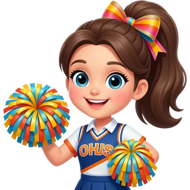 The schoolgirl had her hair in a high ponytail, looking pretty and cute, with a brightly colored bow and a little glitter at the corners of her eyes. She was holding cheerleading pom-poms and seemed cheerful. emoji