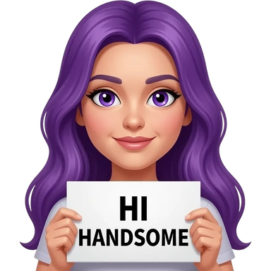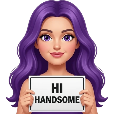 girl with long purple hair holding a HI HANDSOME sign emoji