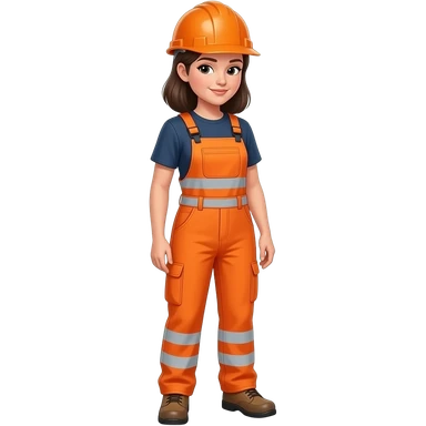 woman, slightly bending, in full orange hi-vis overalls with sleeves and hard hat emoji