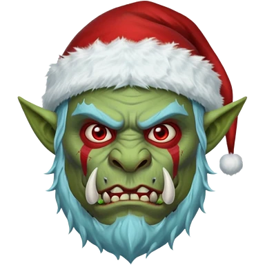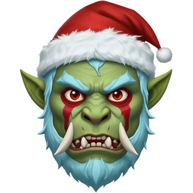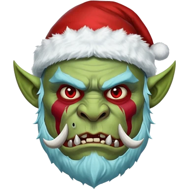 Fantasy orc portrait emoji, Santa Claus hat adapted for orc head with tusks, icy blue and deep red frost war paint on face, brutal winter warrior mood, strong facial features, minimal tribal design, clean high readability emoji style, male/female variant emoji