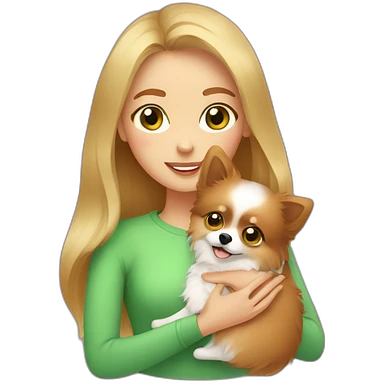 highlighted hair girl with green eyes, hugs her pomeranian dog, red emoji