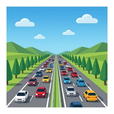 A busy highway with cute fast-moving cars, surrounded by green fields and distant mountains under a bright blue sky emoji