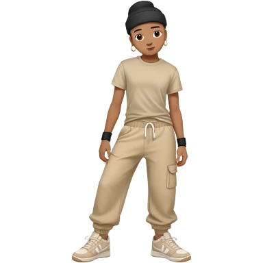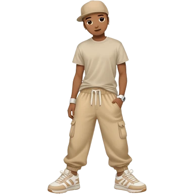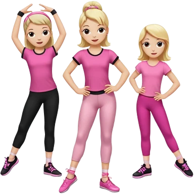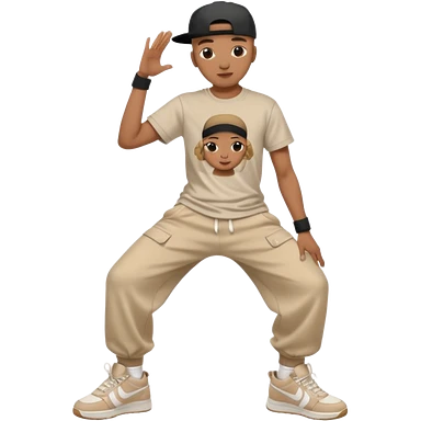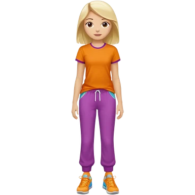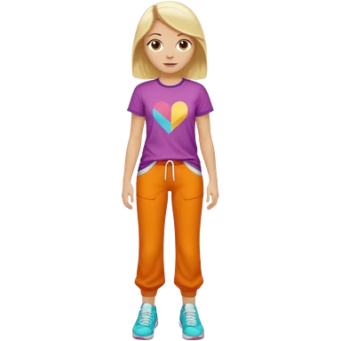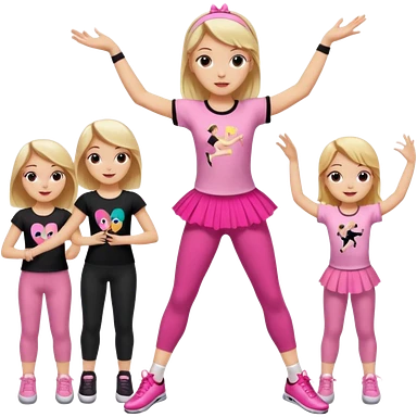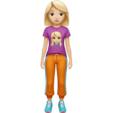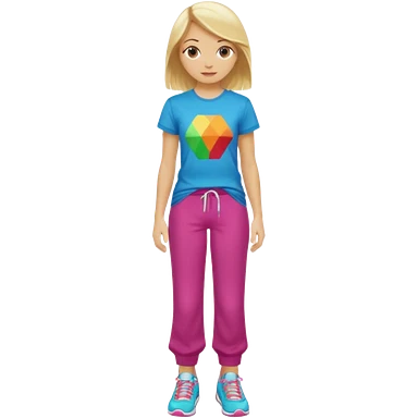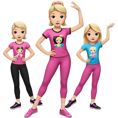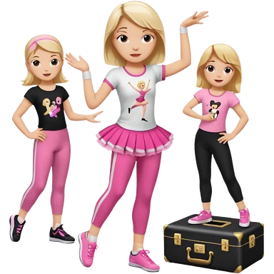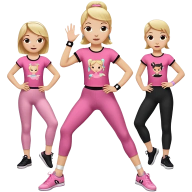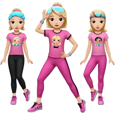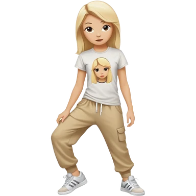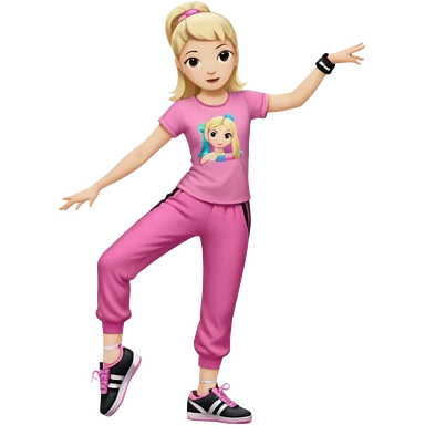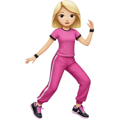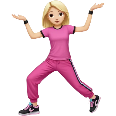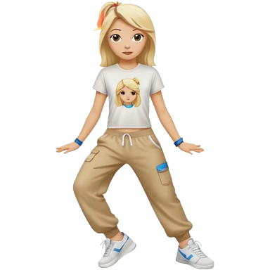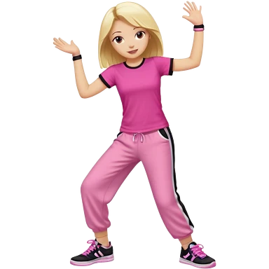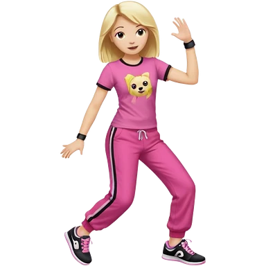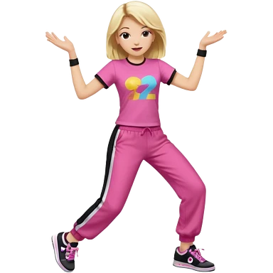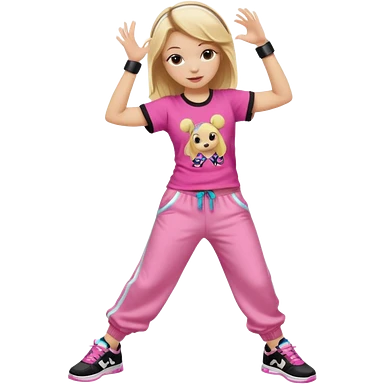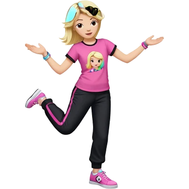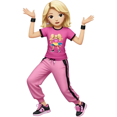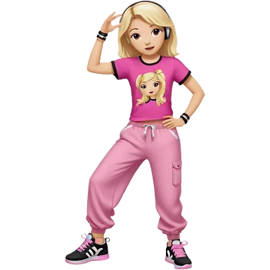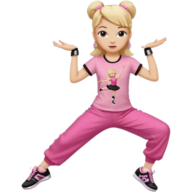 Hiphop dancer, with cute big pants, sneakers, and t-shirt. White girl blond. Coloufull shirt. No pocket pants. Dancing. Pink and black plain outfit. No sweatbands on the wrist, black music box behind her. Ballerina pose. The third on is amazing. With nothing on the shirtemoji