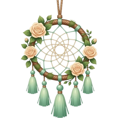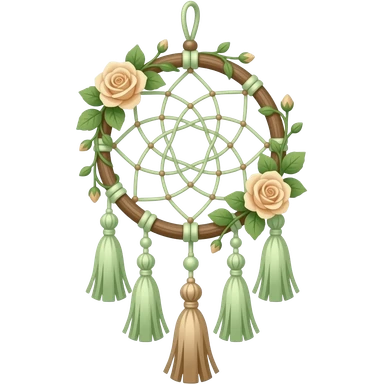 Hippie-like Cute dainty neat Pastel Green-white-brownish-beige-gradients thread-rope-hanging dreamcatcher, pastel colors, whitish, light, green academia aesthetic, mossy, with green vines and beige roses, Cottagecore, Princesscore, shiny glistening, vintage, pearls, tassels emoji | AI Emoji Generator