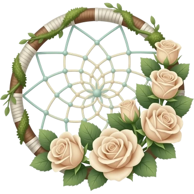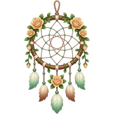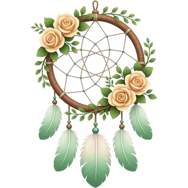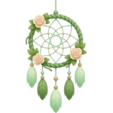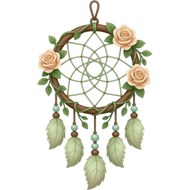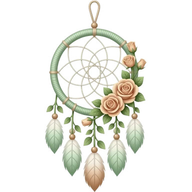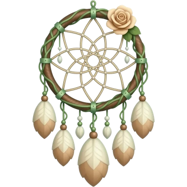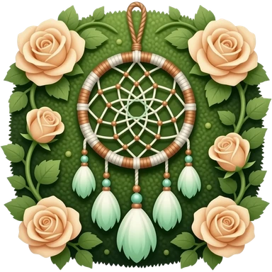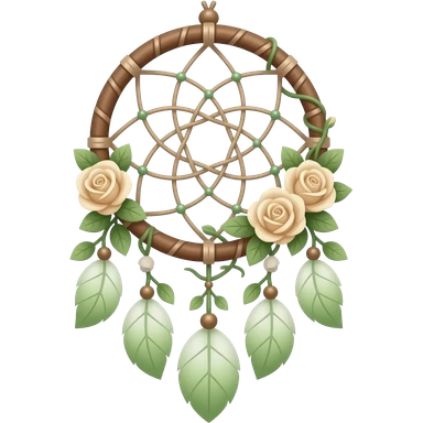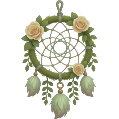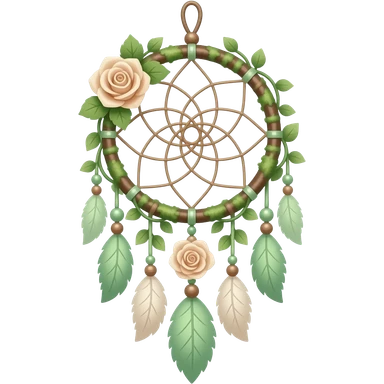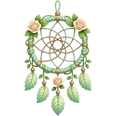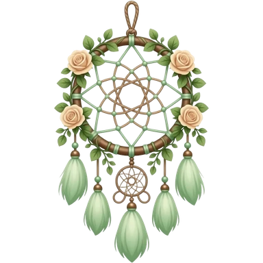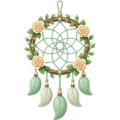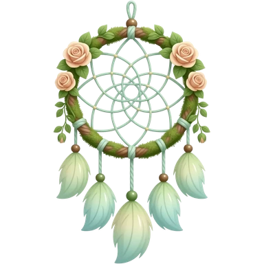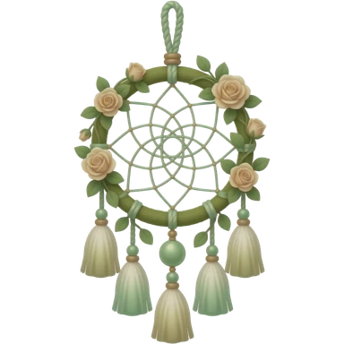 Hippie-like Cute dainty neat Pastel Green-white-brownish-beige-gradients thread-rope-hanging dreamcatcher, pastel colors, whitish, light, green academia aesthetic, mossy, with green vines and beige roses, Cottagecore, Princesscore, shiny glistening, vintage, tassels emoji | AI Emoji Generator