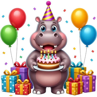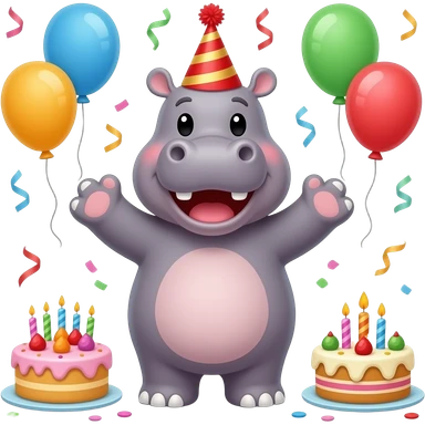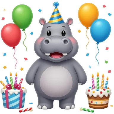 Hippo birthday! Party hat and confetti and happy on its birthday emoji
