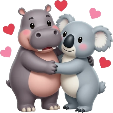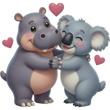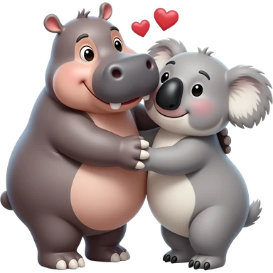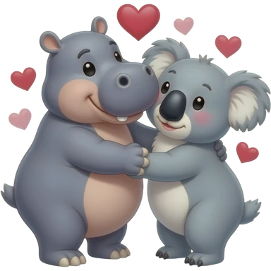 Hippo kissing koala face in love. Cuddling. Hugging. Realistic. Not cartoon. Hearts. emoji
