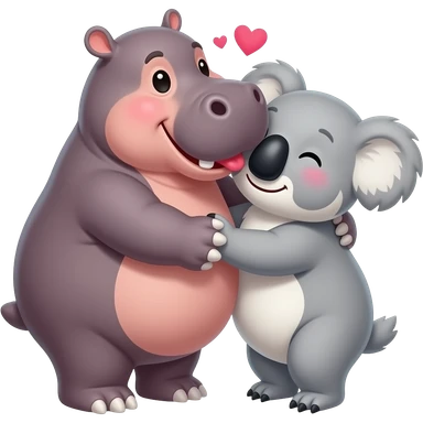 Hippo kissing koala face in love. Hugging. Realistic. Not cartoon. Hearts. emoji
