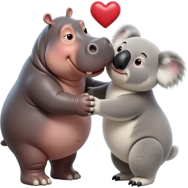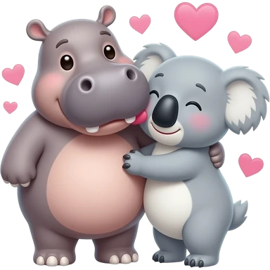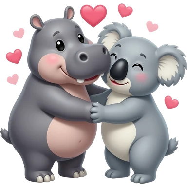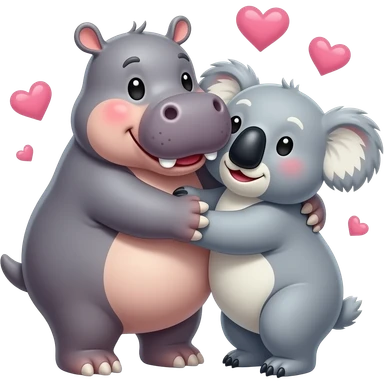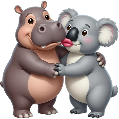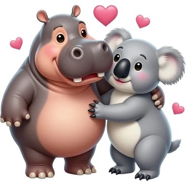 Hippo kissing a koala face in love. Cuddling. Hugging. Realistic. Not cartoon. Hearts. emoji