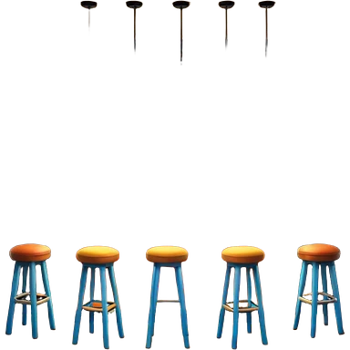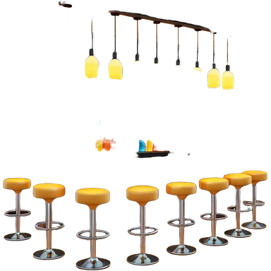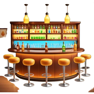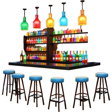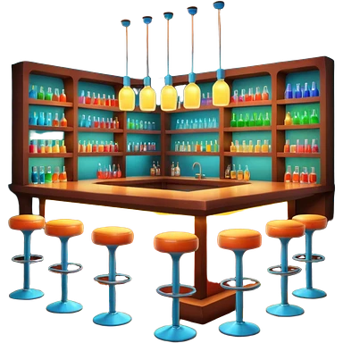 A 3D cartoon bar counter with tall stools, hanging yellow lights, and shelves filled with colorful bottles in the background. Smooth textures, warm ambient lighting, realistic reflections, dark background, Memoji-style design. emoji
