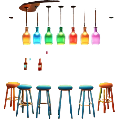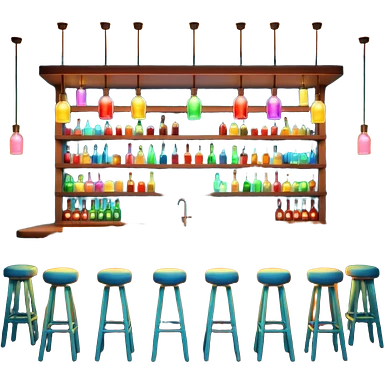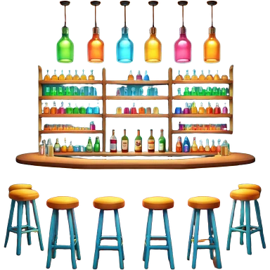 A 3D cartoon bar interior with a counter, glowing shelves of colorful bottles, tall stools, and hanging lights, warm ambient lighting, realistic reflections, Memoji-style. emoji
