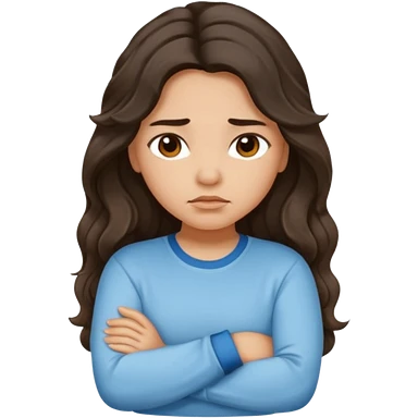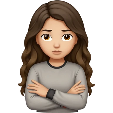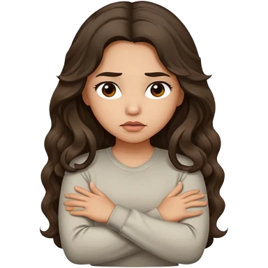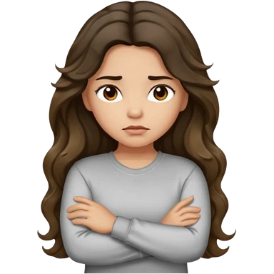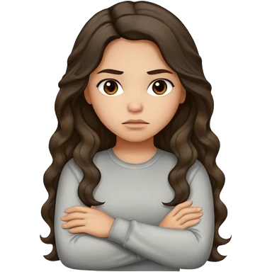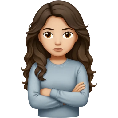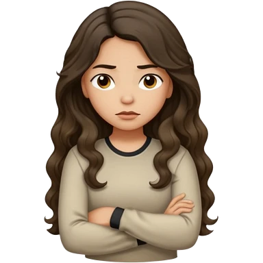 Hispanic light tan girl with long dark wavy hair pouting and arms crossed. Wearing a long sleeve. Hair with middle part. emoji