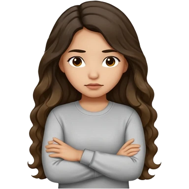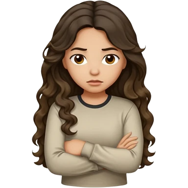 Hispanic light tan girl with long dark wavy hair slightly pouting and arms crossed. Wearing a long sleeve. Hair with middle part. emoji
