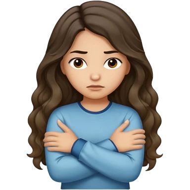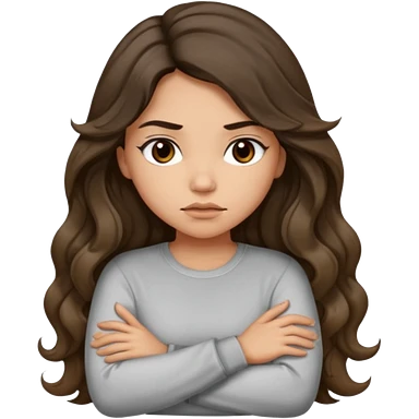 Hispanic light tan girl with long dark wavy hair with arms folded while pouting. Wearing a long sleeve. Hair with middle part. emoji