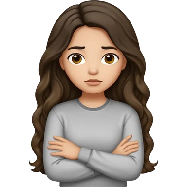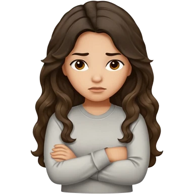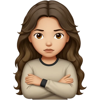 Hispanic light tan girl with long dark wavy hair pouting and arms folded. Wearing a long sleeve. Hair with middle part. emoji