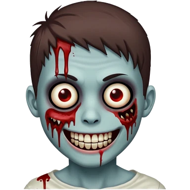 zombie boy with emo brown hair, white skin, and white eyes; an open smile, and bloodied teeth; emoji