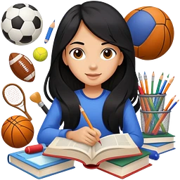 differemt girlhood hobbies floating back ground, books, art, and sports, tanned long black hair, simple emoji
