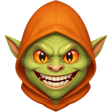 Hobgoblin-style goblin face emoji, orange hood, evil grin, sharp teeth, expressive Apple-style emoji emoji