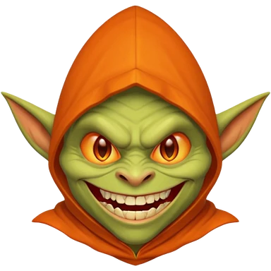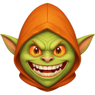 Hobgoblin-style goblin face emoji, orange hood, evil grin, sharp teeth, expressive Apple-style emoji emoji | AI Emoji Generator
