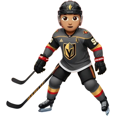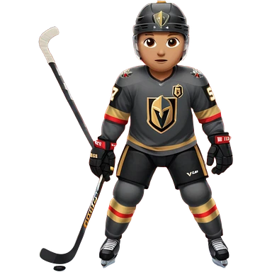 A hockey player in a Vegas Golden Knights black & gold jersey, red accent glow, centered stance, stick on the ice, confident posture. Background subtle red aura with a knight-helmet inspired motif. Clean, bold, emoji-style. emoji