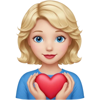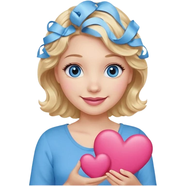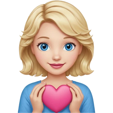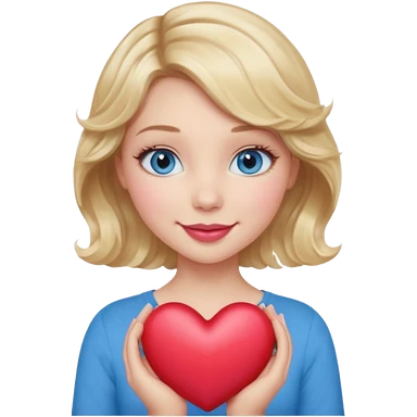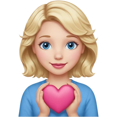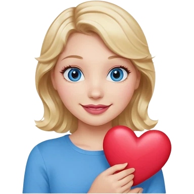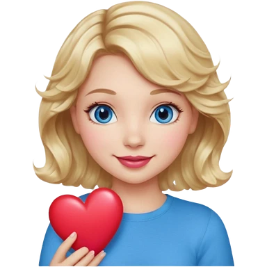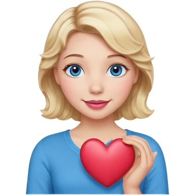Girl Blonde short wavy hair, blue eyes, cute blue top, long lashes, pink lips, smiling, holding a big heart emoji