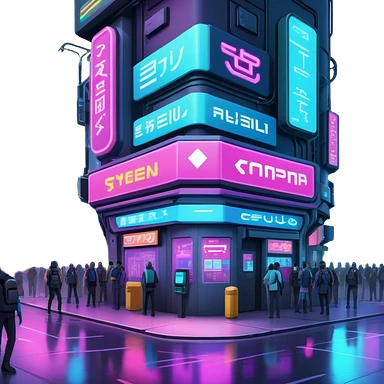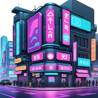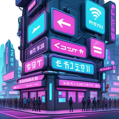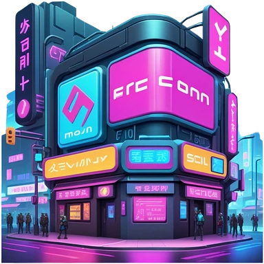 Cyberpunk street corner with neon blinking signage and holographic advertisements emoji