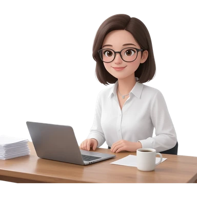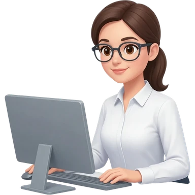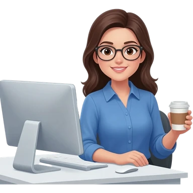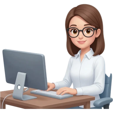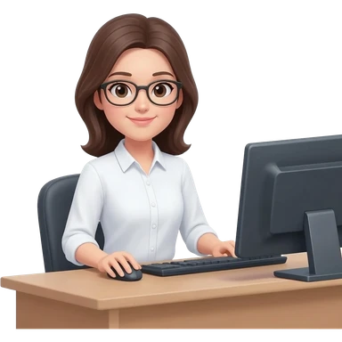 Asistente mujer con camisa manga larga blanca, sin lentes en escritorio con computadora, medio cuerpo imagen tipo emoji Android emoji