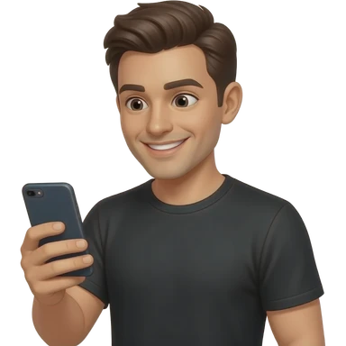 hombre de remera negra,con celular en mano,prestando atencion en su celular,en el rostro se refleja una sonrisa emoji
