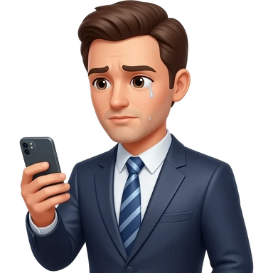 hombre,con traje,tiene celular en mano,prestando atencion en su celular,en el rostro se refleja un poco de agotamiento emoji