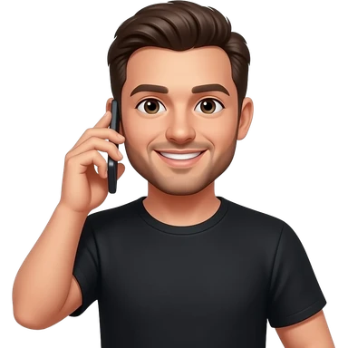 hombre de remera negra,con celular en mano,haciendo una llamada,en el rostro se refleja una sonrisa emoji