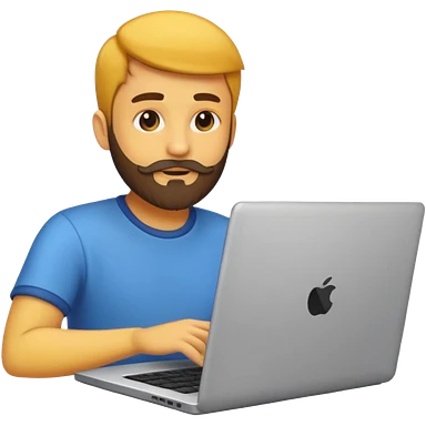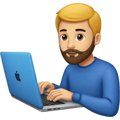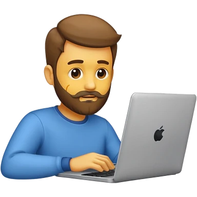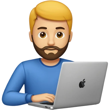 Emoji de un hombre joven con barba corta usando una laptop, estilo emoji moderno y minimalista, colores planos, líneas limpias, expresión amigable, fondo transparente. emoji