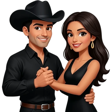 una pareja vestidos de negro el hombre con ropa negra y sombrero de vaquero negro y la chica con vestido negro bailando quebradito el baile mexicano emoji