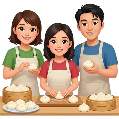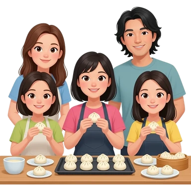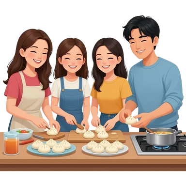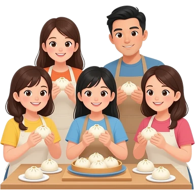 bao bun workshop at home with 5 friends: 1 westen female, 3 asian female and 1 korean male with long hair emoji