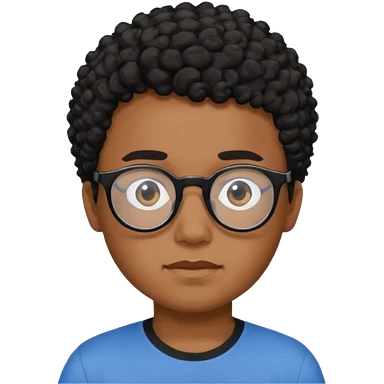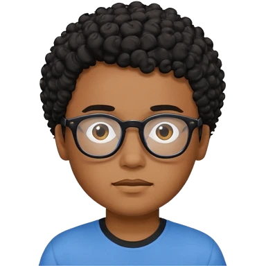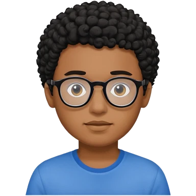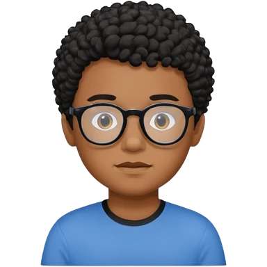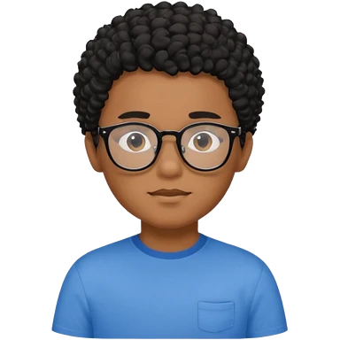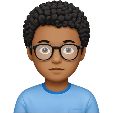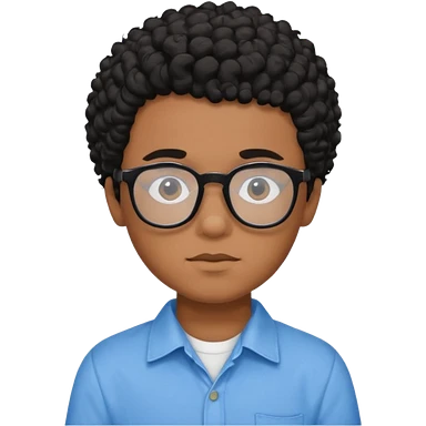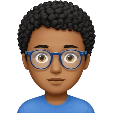 Menino moreno com cabelo curto cacheado preto, de óculos preto e blusa azul emoji