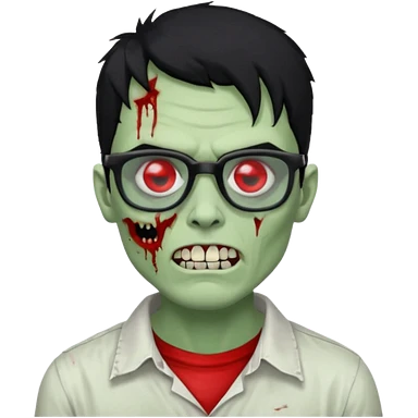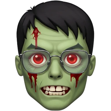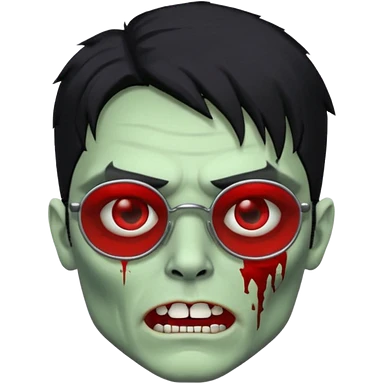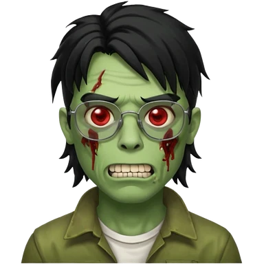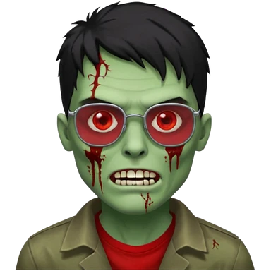 homem zumbi de óculos cabelo preto com muita olheira deixar pele dele verde dentes brancos e olhos vermelhos e ensanguentados deixar óculos quadrado e preto e olhos cheio de veias vermelhas e encher o rosto de piercings colocar piercing em todo rosto piercing prataemoji