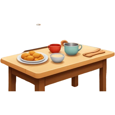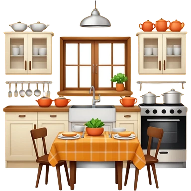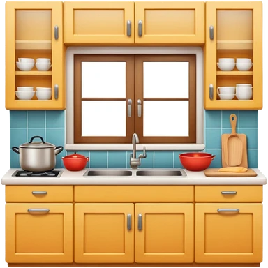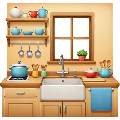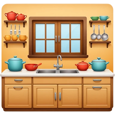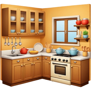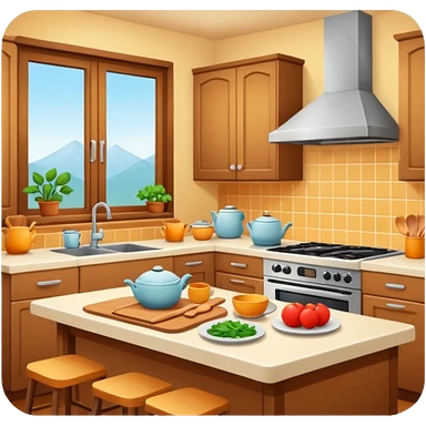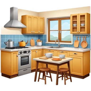 A cozy home kitchen in clean emoji-style illustration. Warm colors, simple shapes, homemade dishes on the counter, friendly atmosphere, flat design, high contrast, clear outlines. emoji