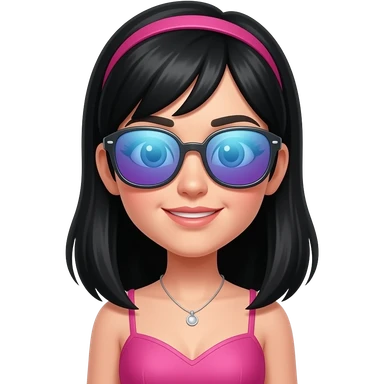 A character wearing bright reflective sunglasses, black hair, pink dress. emoji