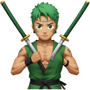 Roronoa Zoro with green hair, three swords, white shirt, green haramaki emoji