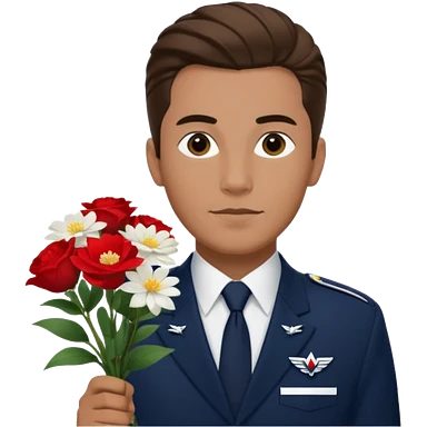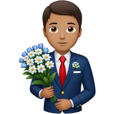 Homme avec bouquet fleurs blanches, avec uniforme bleu foncé cravate rouge, arabe raie sur le coté, brun un peu bronzé et yeux marrons emoji