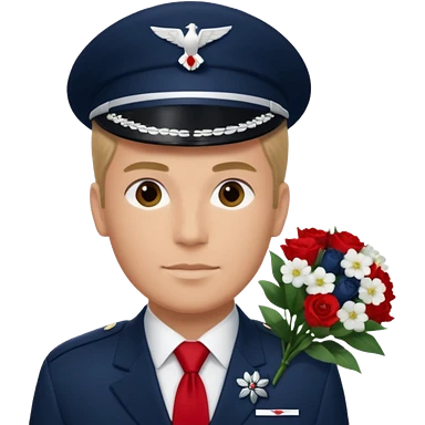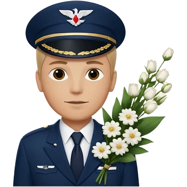 Homme avec bouquet fleurs blanches, avec uniforme bleu foncé cravate rouge comme Air France, arabe raie sur le côté sans chapeau juste insigne sans bouton manchette et un peu bronzée emoji